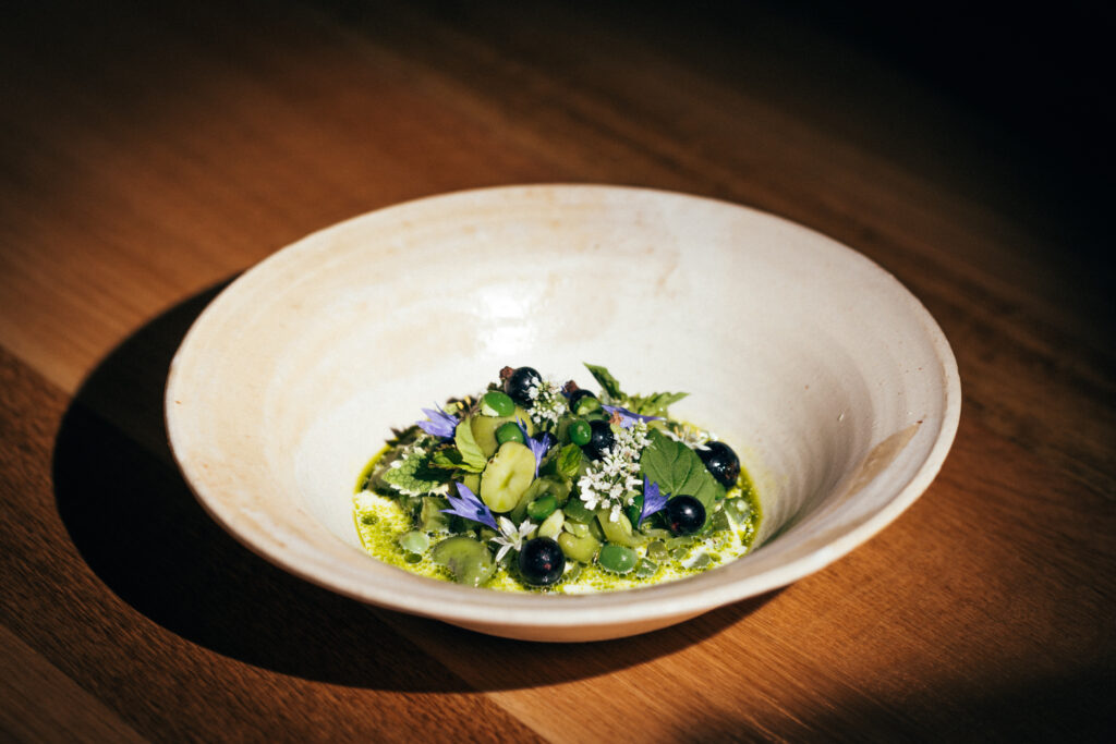 The team visits their farmers every week, following the harvest and letting nature set the rhythm. Inside, second-hand furniture and soft textures create a warm, tactile setting, while renewable energy keeps the kitchen running.